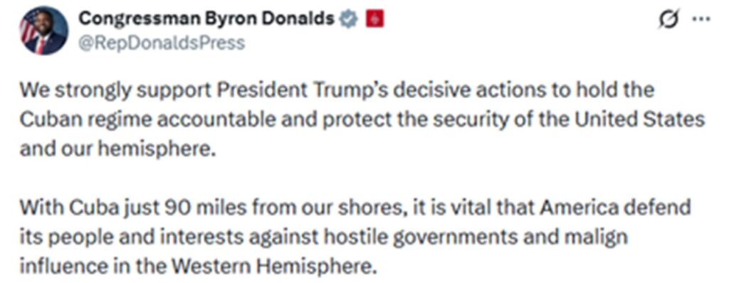 “Apoyamos firmemente las acciones decisivas del presidente para hacer rendir cuentas al régimen cubano y proteger la seguridad de Estados Unidos y del hemisferio”. En su declaración, el congresista advirtió sobre la proximidad geográfica de la isla, a solo 90 millas de las costas estadounidenses, y subrayó la necesidad de contrarrestar lo que describió como influencias hostiles en la región.