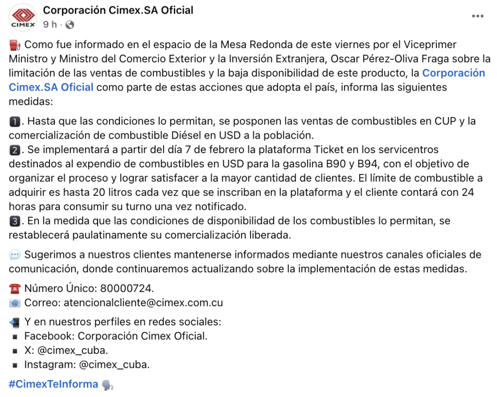 La corporación estatal CIMEX S.A. informó que, “hasta que las condiciones lo permitan”, se posponen las ventas de combustibles en CUP y la comercialización de diésel en USD a la población. La medida se inscribe en un paquete de decisiones adoptadas por las autoridades comunistas para enfrentar la grave escasez de combustible, que ha generado apagones prolongados, parálisis del transporte público y dificultades para el funcionamiento de servicios básicos.