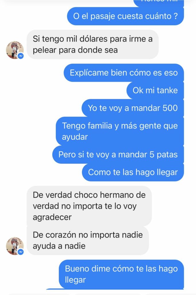 “Choco mi hermano ayúdame a salir de aquí soy fanático tuyo desde que estabas aquí en Cuba, tengo una foto un día que estabas grabando en casa de chico Fran aquí en playa ayúdame sé que no tienes obligación, pero no cuesta pedirte la ayuda, no quiero estar más aquí ayúdame para ver si parto rumbo a cualquier lugar solo 1000 con el pasaje tengo ayúdame estoy desesperado”, fue parte del mensaje del seguidor al artista.