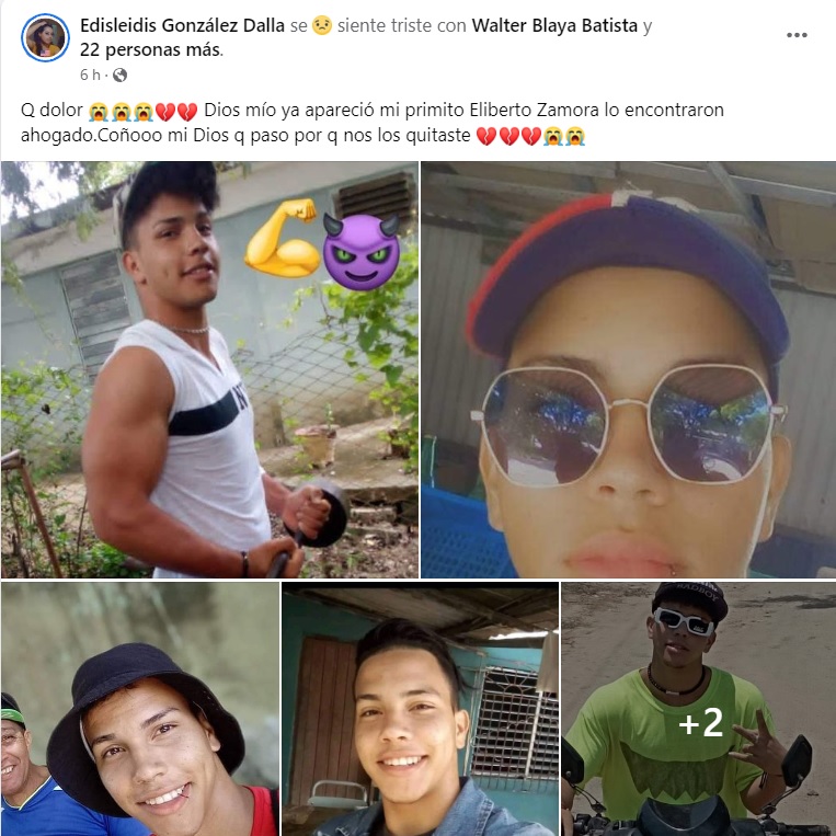 “Qué dolor. Dios mío, ya apareció mi primito Eliberto Zamora, lo encontraron ahogado”, escribió en un post junto a fotografías del muchacho.