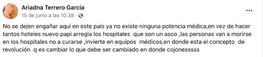 “En el Hospital Pediátrico de Guantánamo me dice la doctora que está ahora mismo (8:00 a.m.) que tengo que esperar porque ya ella terminó su turno de guardia, cuando todavía faltaba 20 minutos. Como si estuviéramos hablando de Gastronomía o cualquier otra empresa y entonces somos continuidad y vamos por más y más que nada somos una potencia médica”, dijo Aliena García Leyva en un grupo de Facebook.