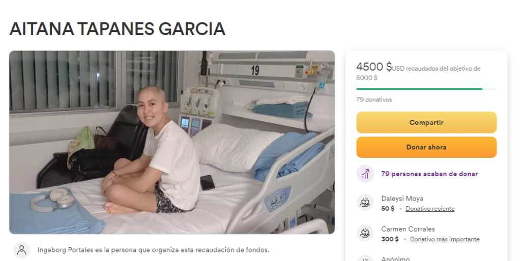 Según informó Amelia Calzadilla en Facebook, la familia de Aitana lanzó recientemente una campaña de recaudación de fondos en la plataforma GoFundMe para cubrir los costos de su tratamiento.