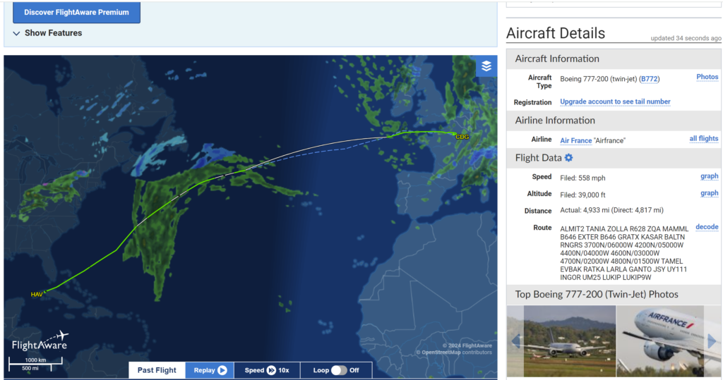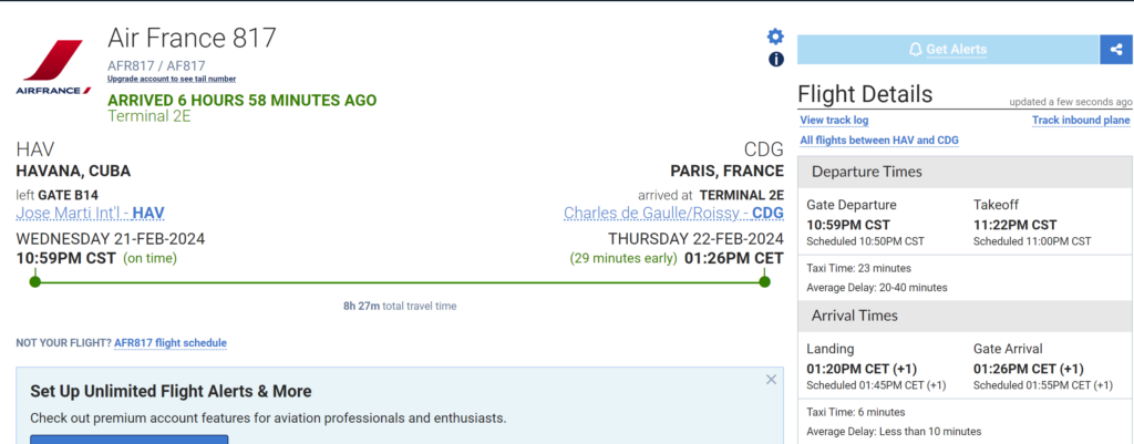 El viaje, que comenzó con un vuelo desde el Aeropuerto de La Habana, Cuba (HAV), el 21 de febrero, con un despegue a las 11:22 PM desde la Terminal 3 – Puerta B14, tenía como primer destino París, Francia (CDG).