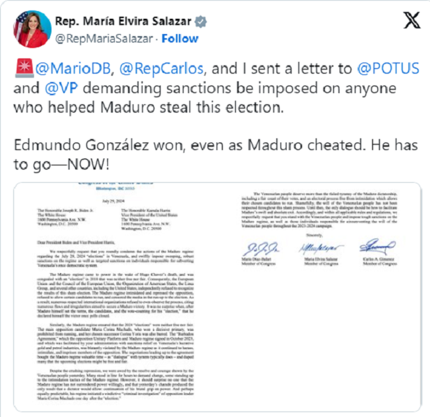 En un comunicado conjunto, los congresistas Mario Díaz-Balart, María Elvira Salazar y Carlos Giménez reafirmaron su compromiso de presionar al gobierno estadounidense para que apoye a los líderes legítimos de Venezuela.