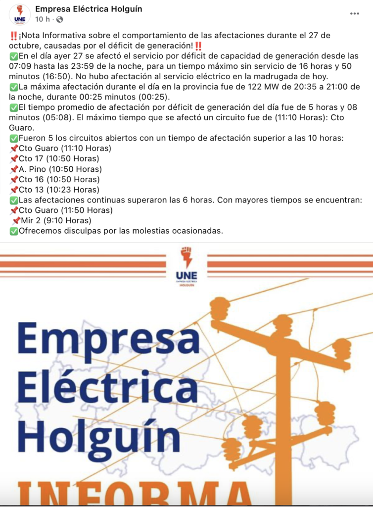 La información la dio a conocer la Empresa Eléctrica de Holguín, a través de sus redes sociales, donde informaron sobre el déficit de generación que provocó apagones de hasta once horas este domingo 27 de octubre en uno de los circuitos de la provincia.