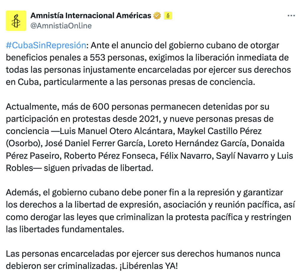 “Ante el anuncio del régimen cubano de otorgar beneficios penales a 553 personas, exigimos la liberación inmediata de todas las personas injustamente encarceladas por ejercer sus derechos en Cuba, particularmente a las personas presas de conciencia”, dijo Amnistía Internacional en el comunicado.