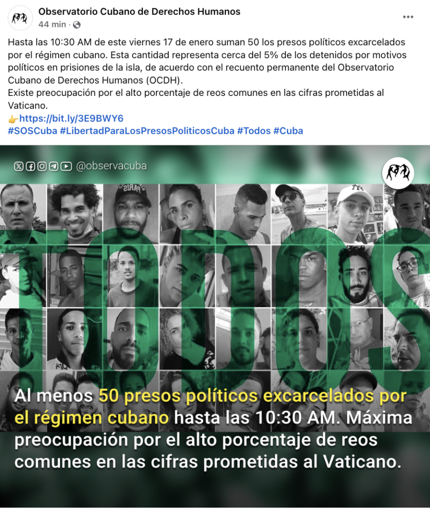Hasta horas de la mañana de este viernes 17 de enero, al menos 50 presos políticos han sido excarcelados, según el conteo que hace el Observatorio Cubano de Derechos Humanos.