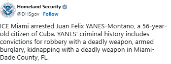 El Departamento de Seguridad Nacional (DHS), fuente de la información, detalló que Yanes Montano enfrentó cargos previos por robo con arma mortal, allanamiento a mano armada y secuestro con arma mortal en el condado de Miami-Dade.